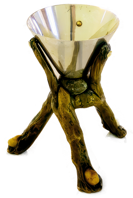 Dieser Kelch hat Pfarrer Theisen sein Leben lang begleitet. Er hat ihn zu seiner Primiz anfertigen lassen. Eingelassen sind Kiesel aus dem elterlichen Garten und dem KZ Dachau.