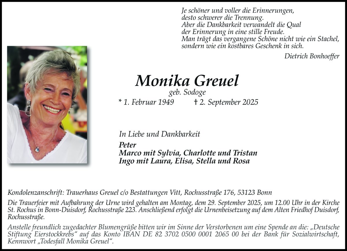 Liebe Monika,dein Lächeln,deine positive Einstellung,deine Herzlichkeit,bleibt immer in uns,danke für alles.Aufrechtige Anteilnahme in der schweren Zeit an Familie P.Greuel
